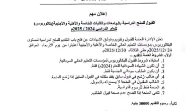 إعلان القبول للمنح الدراسية بالجامعات والكليات الخاصة والأهلية والأجنبية (بكالوريوس) للعام الدراسي 2024 / 2025م