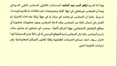 المجلس الطبي السوداني يحذر من إنتحال اسمه لعقد دروات تدريبية أو تفويض أي جهة لنشر إعلانات أو منح شهادات أداء الإمتياز