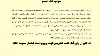 المجلس الطبي السوداني : مواعيد أداء القسم للخريجين الجدد ستكون في يوم إنعقاد إمتحان ممارسة المهنة