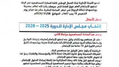 علن بنك العمال الوطني عن عقد إجتماع الجمعية العمومية للمساهمين وذلك يوم الخميس 8 يناير 2026م بقاعة الربوة في بورتسودان…