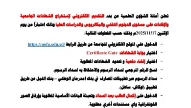 أعلنت أمانة الشؤون العلمية بجامعة الجزيرة عن فتح إجراءات التسجيل للطلاب الخريجين لإستخراج الشهادات الجامعية والإفادات علي مستوي الدبلوم…