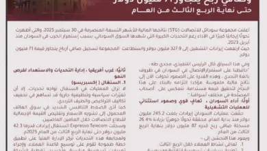 أعلنت مجموعة سوداتل للاتصالات نتائجها المالية للأشهر التسعة المنصرمة في 30 سبتمبر 2025م، والتي أظهرت تحولًا إيجابيًا كبيرًا في الأداء…